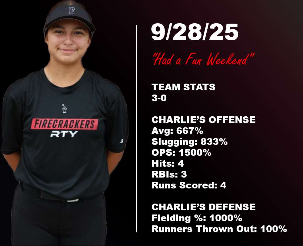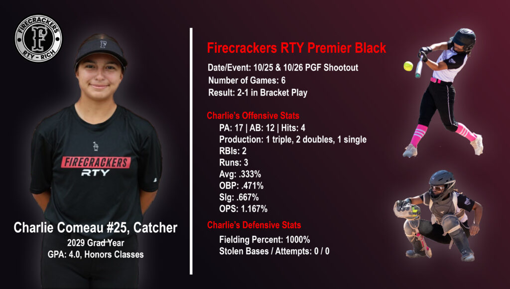 Charlie Comeau is a top 2029 softball catching prospect who plays for the 14U Firecrackers RTY Premier Black team. Charlie is a force behind the plate and a middle of the lineup hitter that hits for power and high OPS. Charlie’s best pop-time is 1.60 seconds from home to second. She manages her pitching staff to get the best performance per pitcher and ensures her teammates are aligned with appropriate situational defensive schemes. Outside of catching, Charlie also plays first base and right or left field.