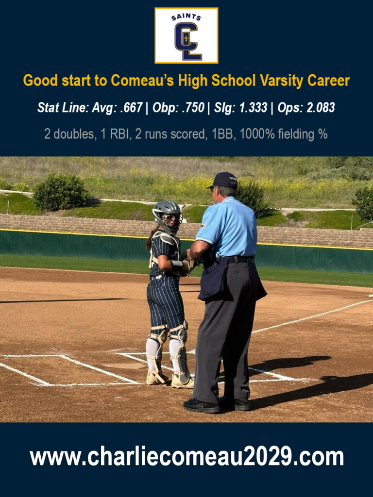 Charlie Comeau with a solo homerun to right-center field. Part of a 4 RBI, 2 for 3 performance. 4.16.26Charlie Comeau with her 2nd double of the day, part of a 4 for 4, 5 RBI performance. 4.15.26Charlie Comeau with her 1st double of the day, part of a 4 for 4, 5 RBI performance. 4.15.26Charlie Comeau with a line drive double that short-hops the centerfield fence. 4.14.26Charlie Comeau with a homerun to dead center field. This makes 1 homerun per game for the past 4 games (if the Avalon field had fences). Charlie Comeau with an RBI double oppo on 4.1.26Charlie Comeau with an opposite field homerun to left against Esperanza. 3.31.26Charlie Comeau hits a monster “grand slam homerun” that would be out of any stadium, except for in Avalon Catalina where there are no fences and the center fielder is playing you in another zip code. (Charlie was 4 for 6 on the day with her only two outs being homeruns if there were fences.Charlie Comeau with a “homerun” except in Avalon where there are no fences and the center fielder plays you so deep. Part of a 4 for 6 performance on the day with her only two outs being homeruns in any stadium that has a fence. Charlie Comeau with an oppo double to left field. Charlie Comeau 2029 with a clutch triple to the fence in a tie ballgame. She scored the winning run on the next play. Charlie Comeau 2029 with a linedrive double to the fence and takes 3rd on the throw. Charlie Comeau hits a walk-off solo homerun to right center field. Part of a 3 for 3, 4 RBI day. Charlie Comeau just misses a grand slam, but clears the bases with a double off the centerfield wall, then takes 3rd on the throw. Charlie Comeau with a bases loaded, base clearing, triple. 3.3.26Charlie Comeau smokes a ball off the top of the outstretched right fielder’s glove. Charlie Comeau, triple on 2.27.26Charlie Comeau with a double on 2.27.26Charlie Comeau starts her high school varsity career as a freshman with a double to the opposite field. Charlie Comeau with her 2nd double of the day in her high school varsity debut. Jacked a line drive off the base of the fence. Charlie Comeau hits a monster 2 run homerunCharlie Comeau hitting a moonshot home run to right. Part of a 5 for 5 day with 4 RBIs. Charlie goes with the pitch for an oppo double Charlie hits an RBI double oppoCharlie with a bases loaded line drive scoring twoCharlie, on 2nd, jumping to avoid being hit by the line drive then scoresCharlie launches a ball off the top of the fence and just misses a homerun by a few inches. Charlie Comeau hits a double off the Corona Angels. Charlie Comeau hits a double off Corona Angels MC 2030. Charlie Comeau narrowly misses a homerun and hits a double off BSC Bengals Briggs R. Charlie Comeau almost has an inside the park homerun but settles for a triple against the BSC Bengals Briggs R. Charlie Comeau smokes a line-drive for a double against Lady Magic Allen 2029.Charlie Comeau hits a triple off the SoCal Bandits. One of 3 hits for her in the game. Charlie Comeau with a double off the SoCal Bandits. One of three hits for her in the game. Charlie Comeau with an RBI double against Athletics Mercado. Charlie Comeau working on staying through the ball on an outside screwball. (4.3 GPA student mispelled “paid”. We got enough of a laugh out of it that we left it.)Charlie Comeau with a bases loaded triple off Firecrackers RTY Premier RedCharlie executes a squeeze bunt scoring the run, then purposely gets into a pickle to score the 2nd run.